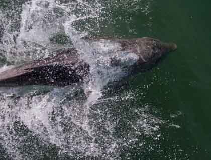 The Delfin II was tied to a tree at the mouth of Nauta Creek or Caño just after lunch. For those of us on the upper deck, the gray and pink river dolphins put on a frothing, frolicking show. Areas where the black water of the forest creeks meet the white water of the river tend to be favorite spots for the dolphins to forage. There was plenty of activity with a variety of dolphin body parts periodically sticking out of the water, including some contortionist move that made a dolphin pop up belly first.