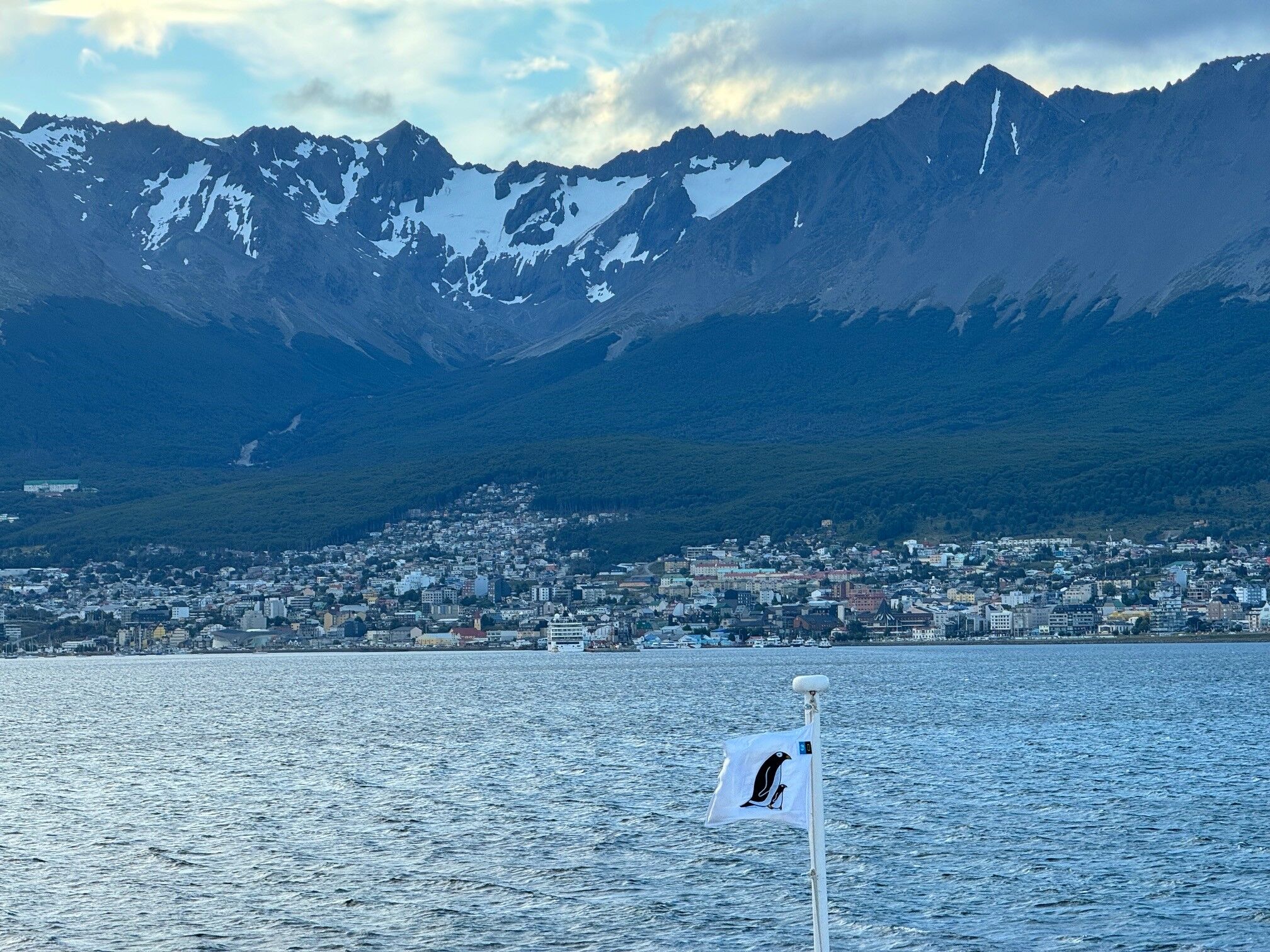 This morning there is once again water as far as the eye can see, and the Drake Passage has not lived up to its intimidating reputation. The sun came out in glorious form and we watched it paint the tops of the waves with orange light. Land Ho! South America has been spotted. Soon the green covered hills of Tierra Del Fuego were clearly seen. Gone are the ice-covered hills, the glaciers, and tabular icebergs. Before us are trees, sea birds, and hints of a town. Black-browed albatross and blue-eyed shags guide us toward the tip of South America as if to help us transition from the life we have lived these past weeks back to the lives we previously knew. How to share what we just experienced with those we love who have not been a part of it is a quandary we all face. How many of our photos do we share to convey the magic? Will anyone honestly understand how we felt being there? Will anyone notice that we have been deeply changed by this past month in Antarctica? And the question that we all ask ourselves, will we be able to keep this experience close to our hearts? “Dolphin!”, someone cries out. Our inner thoughts disappear as Peale’s dolphins bow ride our ship. Then the blows of sei whales are seen and we spend the rest of the afternoon watching their sharp dorsal fins cut the surface of the sea. The ship moves on as life moves on. Our trip is coming to an end. The Beagle channel opens its arms and welcomes us back. Fair winds and following seas fellow travelers.