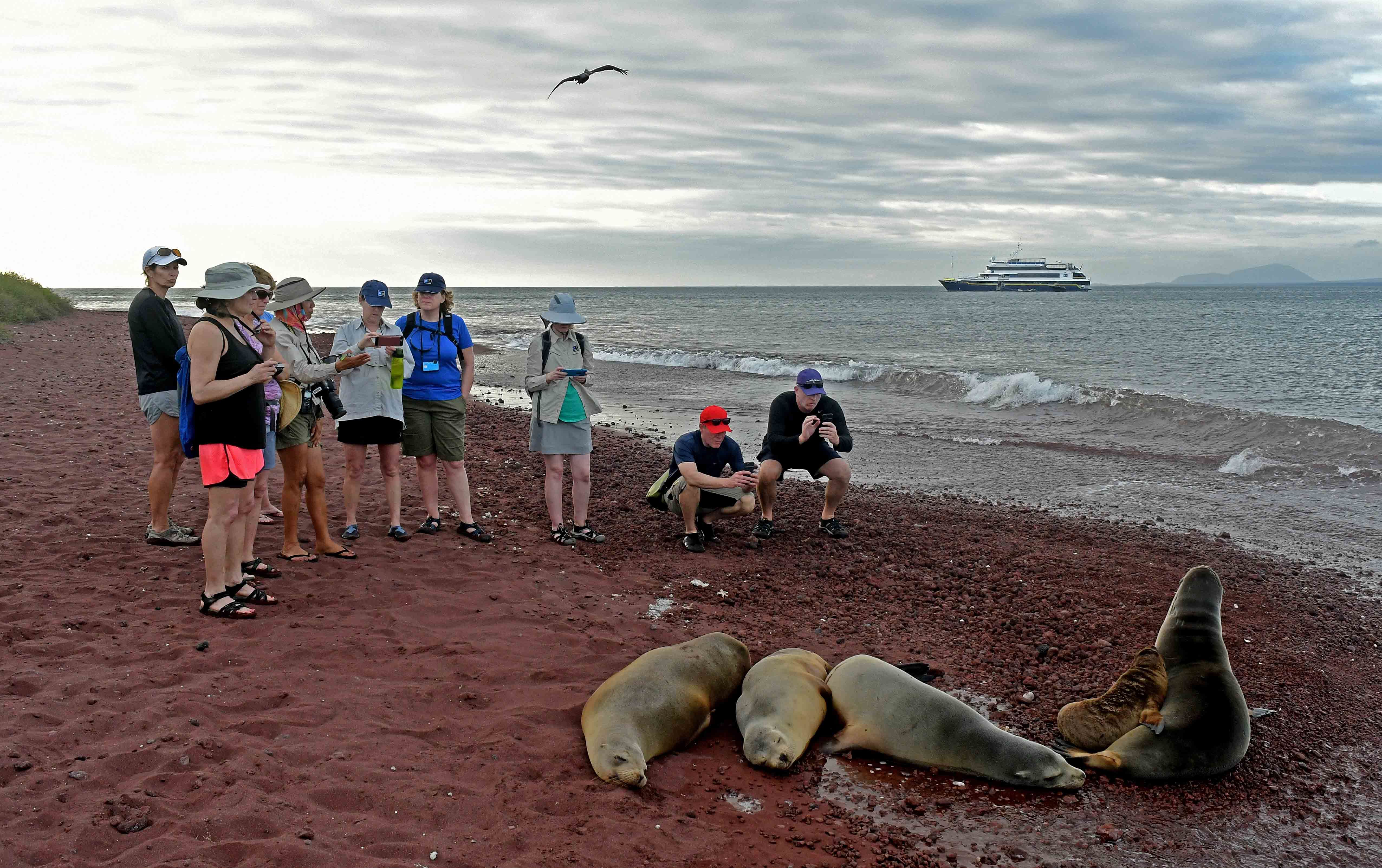 Today National Geographic Quest arrived at the Bay of Panama and we explored the rockeries that sea birds uses as nesting sites, which are becoming one of the most important areas in the country for these species. We got to see some of the local sea birds species in our Zodiacs in what was a fine cruise around this formations of rocks. Blue-footed boobies were one of the highlights of the morning, showing the extraordinary features of their blue feet as an very curious aspect of their natural history. Brown pelicans were observed as well making nests from dry twits and branches. Brown boobies and magnificent frigates birds also were seen in numerous groups.