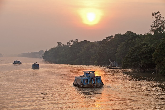 It was an early morning for our first full day in Vietnam. Coffee and snacks awaited us at the bar before we boarded our local longboats to explore the area. We drifted through a floating market at sunrise, where locals were buying and selling goods between boats. Sellers were laden with massive quantities of fresh fruit, including mangoes, pineapples, watermelons and more, all advertised by hanging a bundle of fruit from a bamboo pole at the front of their boat. Buyers loaded the fruit onto smaller boats while women paddled about selling breakfast noodles. Next we headed to a fish farm, where our locals guides filled us in about the important fish farm industry. Upwards of 100,000 fish might live in a net pen beneath people's floating houses! After the fish farm we continued on to Chau Doc. Here we hopped into trishaws, a local form of transportation where a bicycle pulls a small cart, and passengers sit in the cart. We got a terrific tour of the town, including weaving around traffic and seeing street life in full swing. After our ride we wandered through a busy market filled with strange sights and smells before returning to the Jahan.