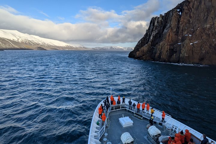 This morning, we awoke to the sheltered waters and towering cliffs of Neptune’s Bellows, a small opening in the natural harbor of Deception Island. After a scenic cruise and a hearty breakfast, we boarded the Zodiacs bound for the enticing volcanic black sands.