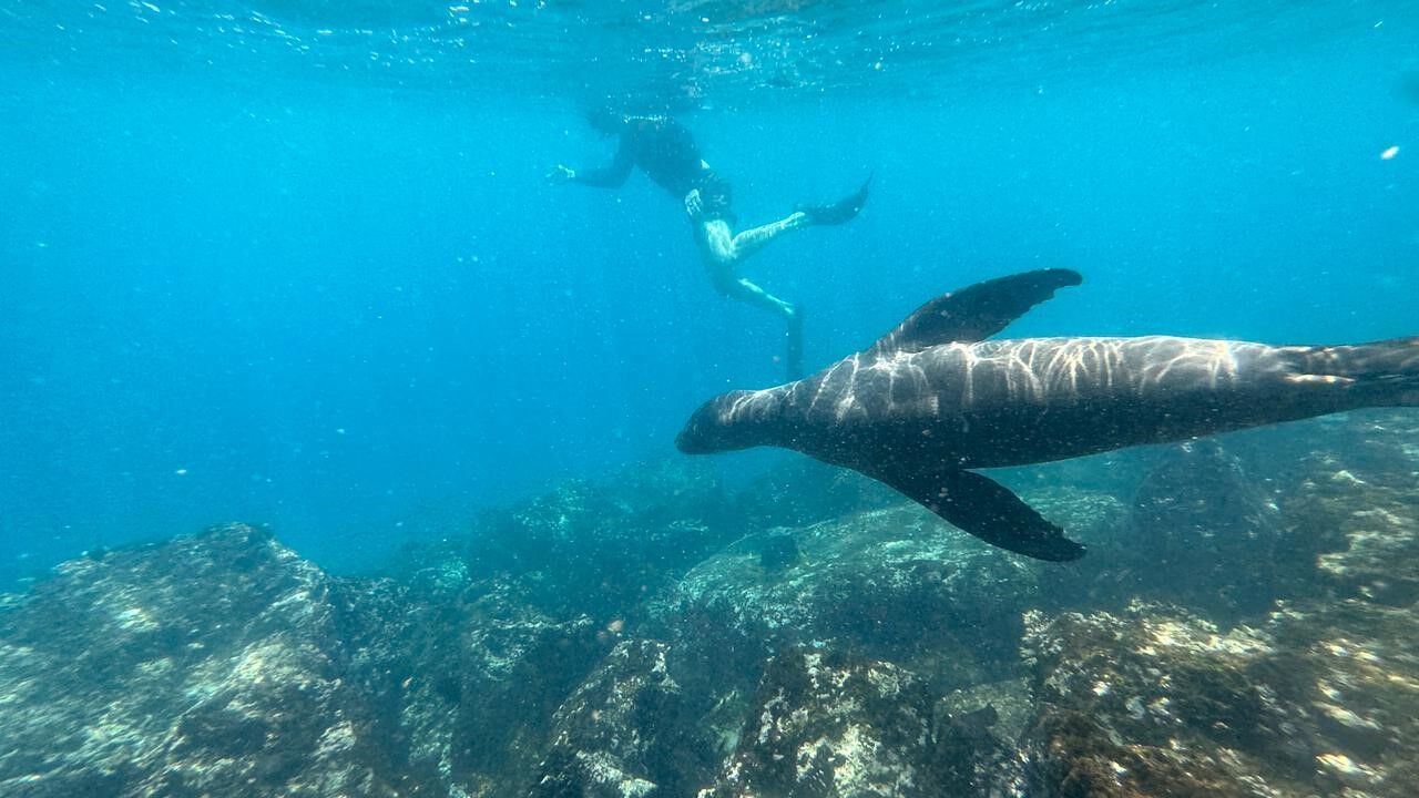 In the morning we explored the turquoise waters and white sandy beaches of Gardner Bay, where a big colony of Galapagos sea lions were basking under the warm equatorial sun. We disembarked on the beach to explore further. It really is a great experience to sit close to sea lions and be part of their lives, to understand their social structure and how they communicate with each other. We also explored the coastline by kayaking and snorkeling. Snorkeling here is a fantastic activity; playing among sea lions, tropical fish, and other marine creatures is certainly one of the greatest experiences of our trip. Then the greatest gift of our day was the unexpected whale show: a big mother humpback whale and her calf came very close to the beach in shallow waters. To have them so close was a memorable experience.
