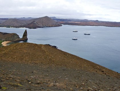 The cloud cover has lifted as we navigate towards northern Isabela and we have a remarkable view of the shield volcanos of Isabela and Fernandina. Upon arrival to Punta Vicente Roca, very close to the equatorial line, we disembark to explore the undersea world here. Almost immediately we encounter a Galapagos penguin swimming among the snorkelers. Pacific green sea turtle are everywhere as this is a resting area in a small bay. These encounters are incredible as a Galapagos flightless cormorant pecks at a guest maybe thinking this could be the “catch of the day.” Diamond sting rays line the sandy bottom as we come to an end of our snorkeling. A quick change and we are off again for a Zodiac ride along the massive cliff walls of Ecuador volcano and we witness flightless cormorants and penguins drying off and preening after their foray into the ocean. Our Captain Fausto lifts the hook and we navigate towards the equator, all the while having a ceremony on the fore deck for our new “shellbacks” as we cross the line into the northern hemisphere.