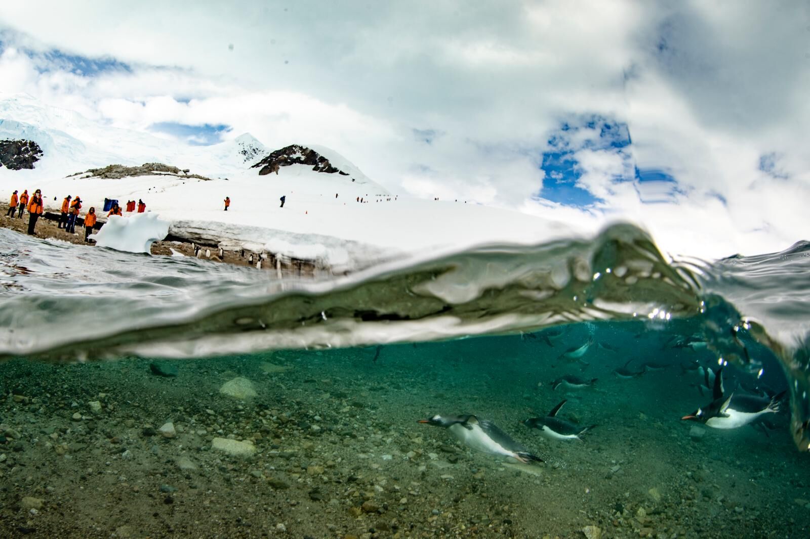 Just when we thought our day couldn’t get any more exciting, three friendly humpback whales breached right off the bow. We watched them feed and listened to them whistle as the sun slowly turned an Antarctic winter orange.
