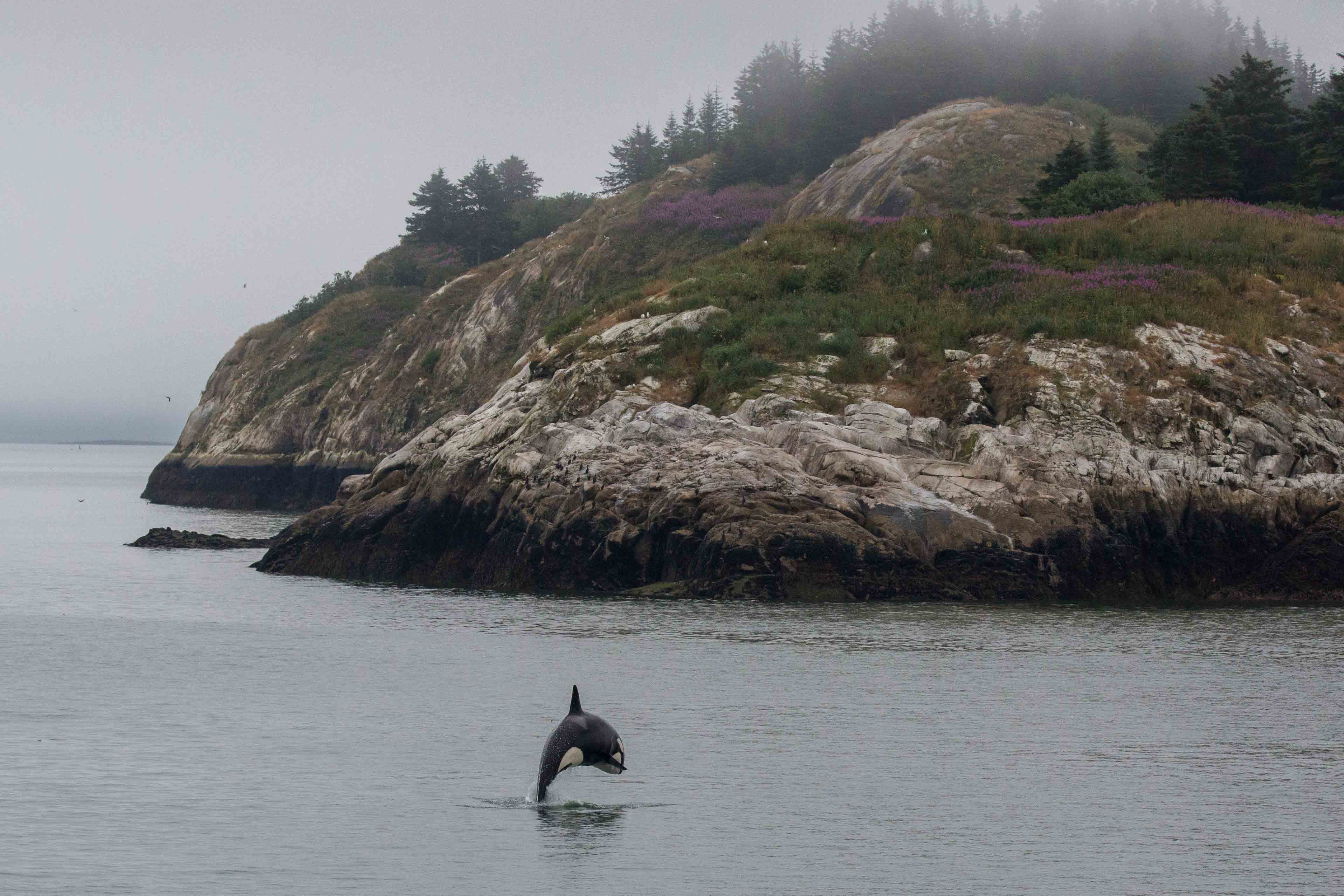 We are exploring the coastline of Chichagof Island the best ways we know how–by kayak, by inflatable expedition craft, and by foot into the rain forest. Being on the water gives us great looks at our charismatic marine mammals, surrounding us with cute sea otters and inquisitive harbor seals. Upon shutting off the motor, we can hear for miles. The deep echoing blow of a humpback whale invites us deeper into the fog. After a few minutes, we find it lunging for food at the surface. Another whale greeted us at Shaw Island, and then two more were feeding amongst our flotilla of kayakers. Back on land, the hikers listen to the whales from the beach, and then upon moving into the woods, are entertained by a serenade of bird songs.
