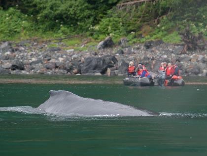 Tidal Inlet was our next destination, after a wonderful park introduction by Victoria and Marylou. Inside the narrow arm, there were hundreds of surf scoters in rafts, all around our ship. We intended to stop by Gloomy Knob, a large, gray, mountainous rock but were happily deterred by the discovery of a gray wolf on the beach! This particular wolf was turning over boulders and searching for edible delicacies underneath. Feeling lucky to be able to watch such an elusive animal, we continued toward Russell Cut, the passage inside of Russell Island. This beach proved to be even more productive than the last, as we witnessed a black wolf, chased by (and also in pursuit of!) gulls and Arctic terns. Undoubtedly the most impressive moment of the day came when the wolf abruptly turned and caught and killed a bird in flight. It was an incredible sight to see and a great example of the animal’s intelligence and speed.