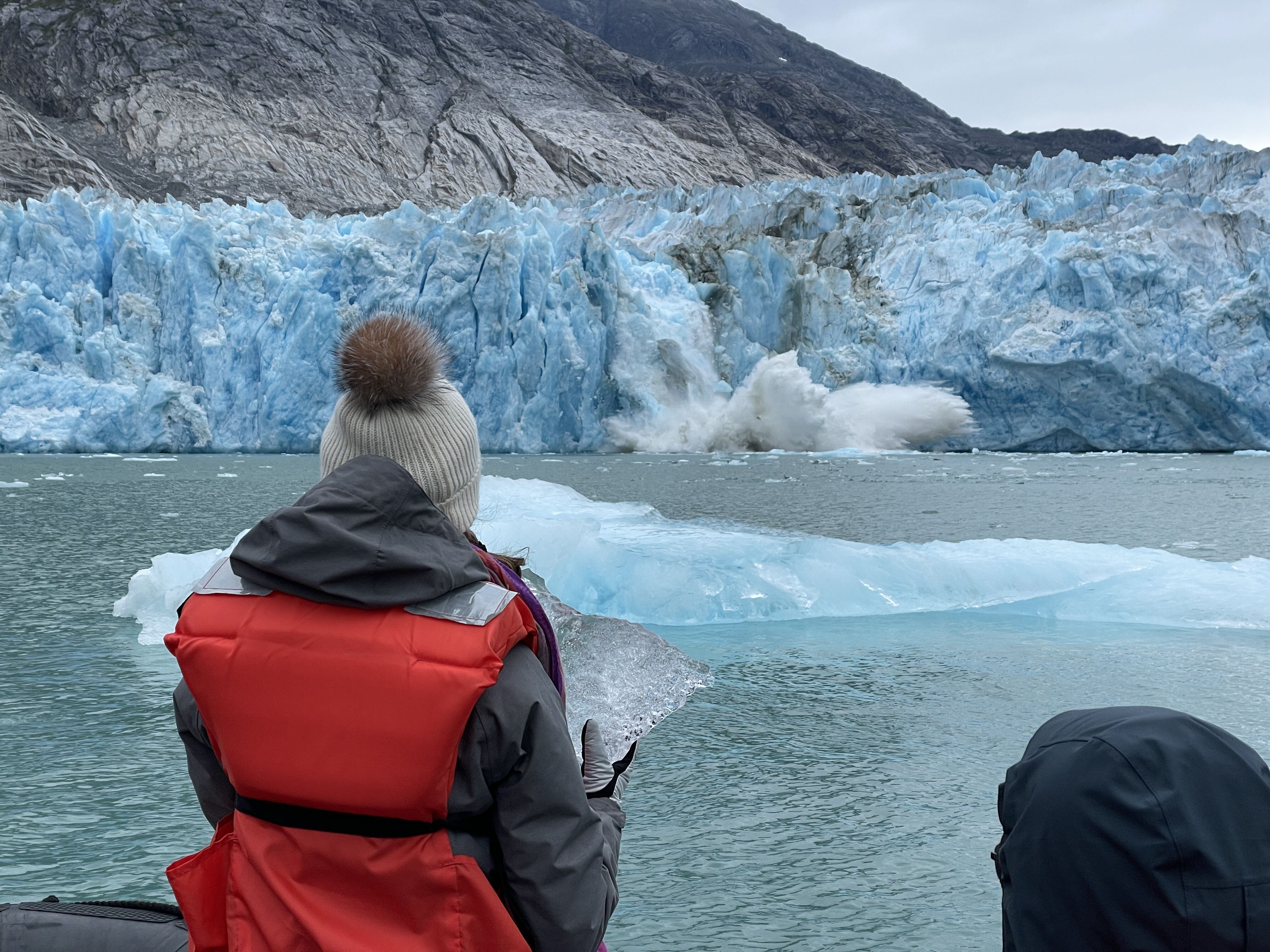 Early risers were greeted to a show of calving when the vessel reached Margerie. Naturalists on the bow attempted to properly convey and contextualize the grandeur of what guests observed: the ice that fell as snow centuries ago had carved the fjord, continuing the grand hydrologic cycle that fuels life on this planet. Evidence of the power and spectacle of glacial force abounds at the face of these tidewater behemoths. The combined awe from the virgin eyes of the traveler and the experience of the naturalists ensured that the bow was buzzing for the entire morning.