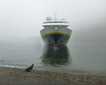 Eager whale watchers boarded the rubber boats for our final outing to watch these magnificent mammals from water level. Backs and spouts broke the glassy surface in almost every direction. With no shortage of cow/calf pairs, we spread out to see individuals spin just beneath the surface, spy hop (as in the photo), and approach our boats for close inspections. The time flew by, and by late morning our local pilot had boarded the ship in readiness for our transit back to Magdalena Bay. He departed after carefully negotiating the narrow and shallow channel, and the ship continued towards the opening between Isla Magdalena, our home for the past few days, and Isla Santa Margarita, a mountainous island of metamorphic rocks.