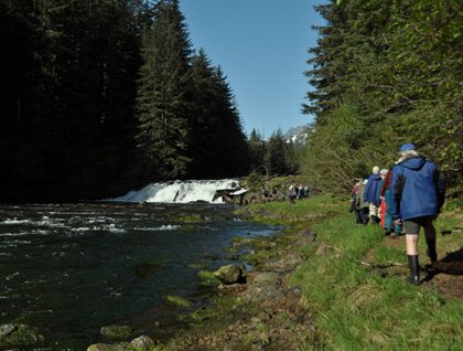 A number of us had chosen the five-hour tour that included a hike to the top of the falls. After a brief chance to take photos of the waterfalls, we motored toward the northeastern bank to commence the climb up the side of the gorge.