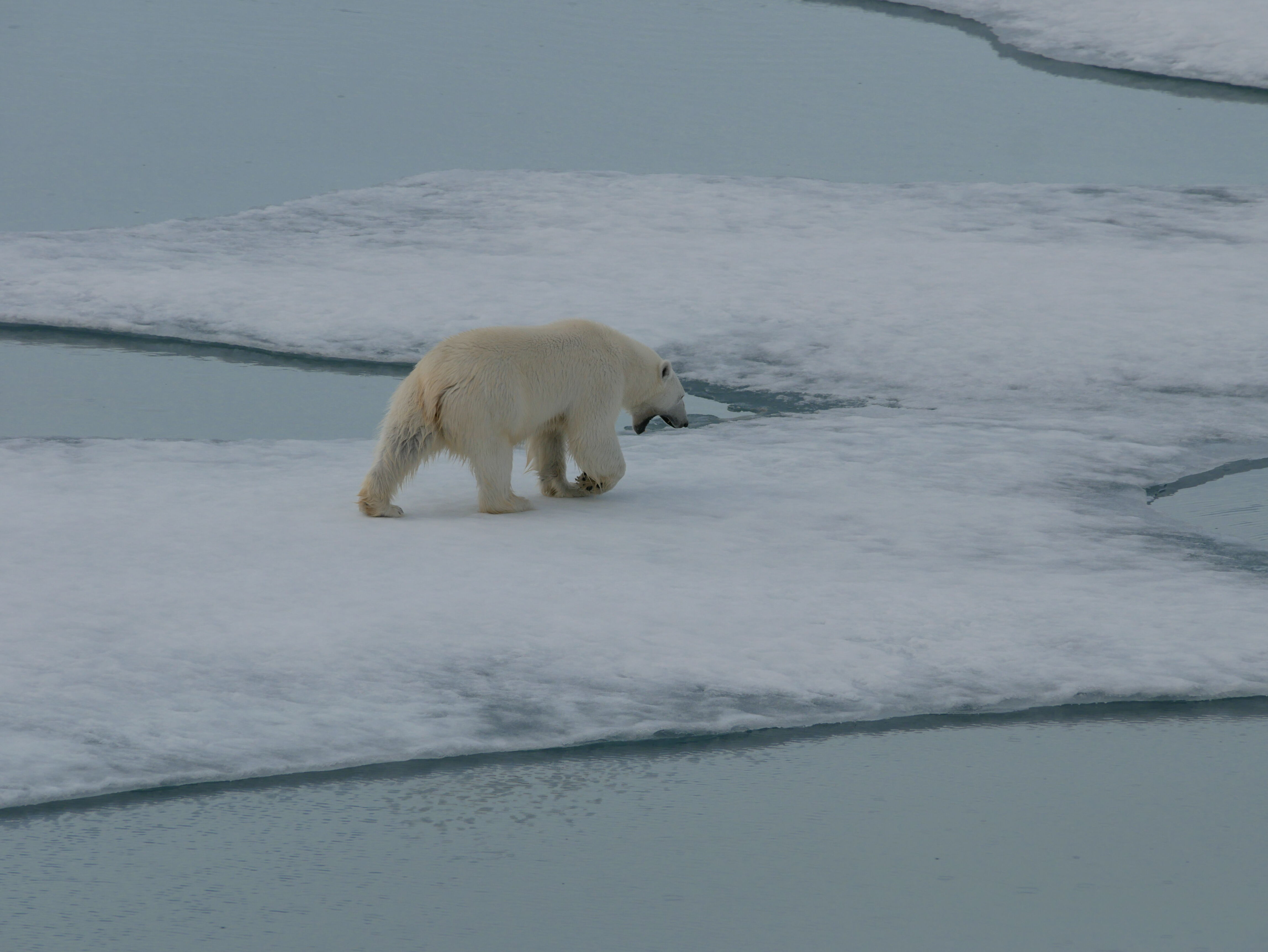 Morning mists create a mysterious seascape, as National Geographic Venture navigates amongst the icebergs in LeConte Bay. This ice has calved from the LeConte Glacier and worked its way down the fjord system to our location near the terminal morraine. Low tide has stranded bergs on the shoreline, an ideal scenario for ice sculpture exploration.