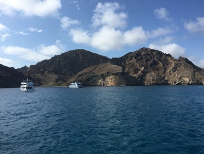 Our new best friend is a volcano. We have been anchored inside it, between the reef and the island, all day—a wonderful day that has given us the opportunity to explore this amazing mountain from above and below. We have strolled through a lovely town under the shade of flowering trees, met the people living there and learned about their history and their thriving black pearl industry. We have climbed to the summit of the precipitous fang of basalt that is the high point of the island and dropped into the cool clear waters around it to wander through the coral gardens and meet a few of the exquisite reef fish that make their home there.
