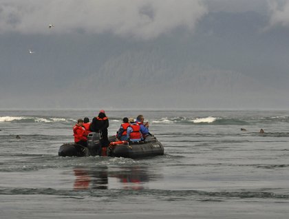 An early start saw our arrival on the sandy beach that fronts the settlement of Pond Inlet on the northern coast of Baffin Island. The warm welcome from members of the local community offset the somewhat inclement weather. One group went on an engaging walk with a local guide along the beach to explore the remains of a Thule settlement. Boulders of multi-patterned and coloured gneiss and other ancient rock types have been washed out of the huge terminal moraine by the action of the waves, deposited at the end of the Ice Age, and were strewn along the sand. Impressive examples of solifluxion were also evident with deposits of sediment slipping down onto the beach fuelled by excessive water runoff.