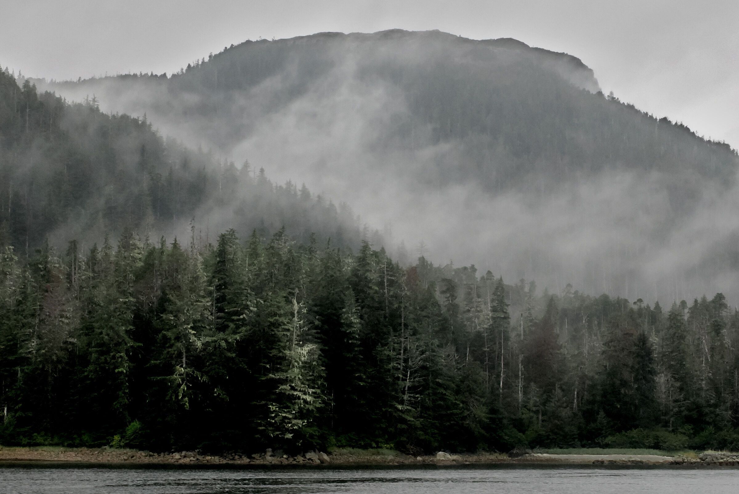 Afternoon activities included two walking tours. The first walk was a hike to the top of nearby Tracey Hill, where guests enjoyed a breathtaking view in all directions. This hiking trail climbed above the forest line to the alpine tundra belt. The second walk on the Boney Shore Walking Trail crossed patches of boreal forest and coastal meadows to a few large and very old, fractured whale skulls among the shore boulders. The whale bones were hardly distinguishable among the granite boulders, as all of them were densely covered with lichens.