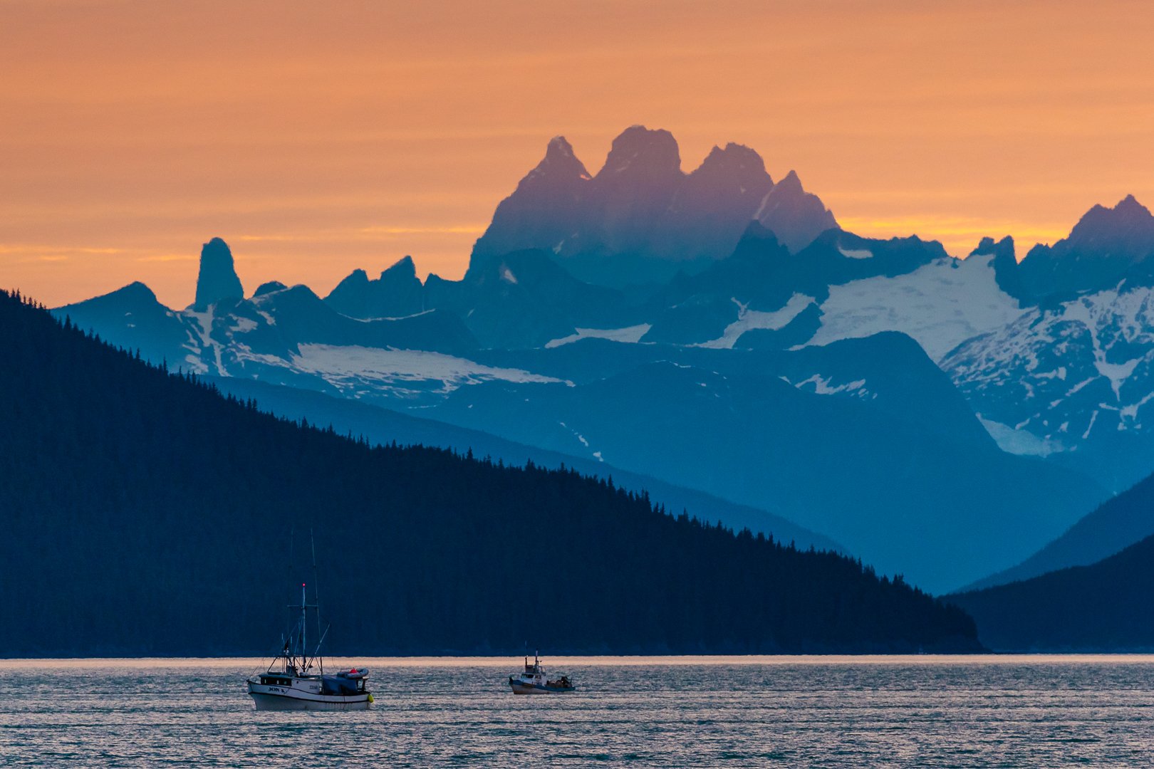 After breakfast, while traveling north through Chatham Strait, we found Fred Sharpe of the Alaska Whale Foundation and his summer interns floating in a zodiac surrounded by a group of nine humpback whales cooperative bubble net feeding.  This is a feeding behavior predominately found in southeast Alaska.  Fred Sharpe recognized many of the whales in the group by their flukes and the sounds of their unique voices they use for frightening fish into prey-balls ready to be swallowed up in their baleen-lined mouths.