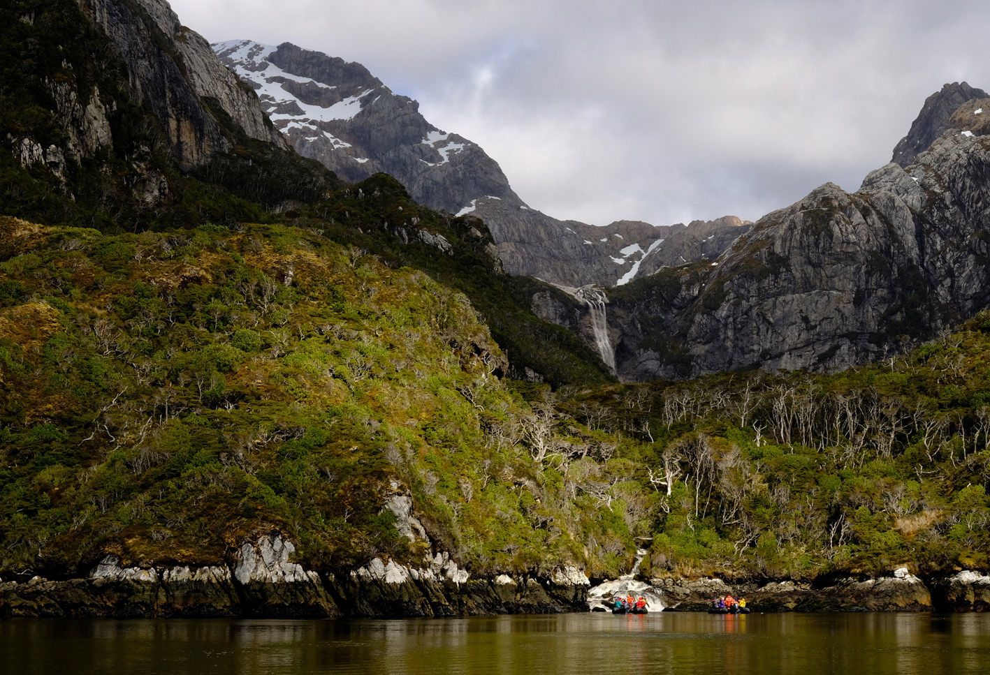 After a delicious lunch of fish tacos and guacamole, we landed at picturesque Elsehul Bay. Guests chose to either take a Zodiac cruise or hike up the rim of the bay to get a closer look at the petrels and albatross nesting in the high grasses. From the Zodiacs, guests watched an abundance of birds—including grey-headed and light-mantled albatross—flying overhead. Nesting South Georgia shags and macaroni penguins could be seen along the cliffs. The trip was pleasantly interrupted by the arrival of a Viking vessel. The Vikings provided hot cocoa on the chilly ride. On the hike, guests got a bird’s-eye view of petrels, skuas, albatross, pipits, snowy sheathbills, and gentoo penguins. Although the climb was slick and rocky and took a considerable amount of effort for the climbers, it proved to be well worth it.