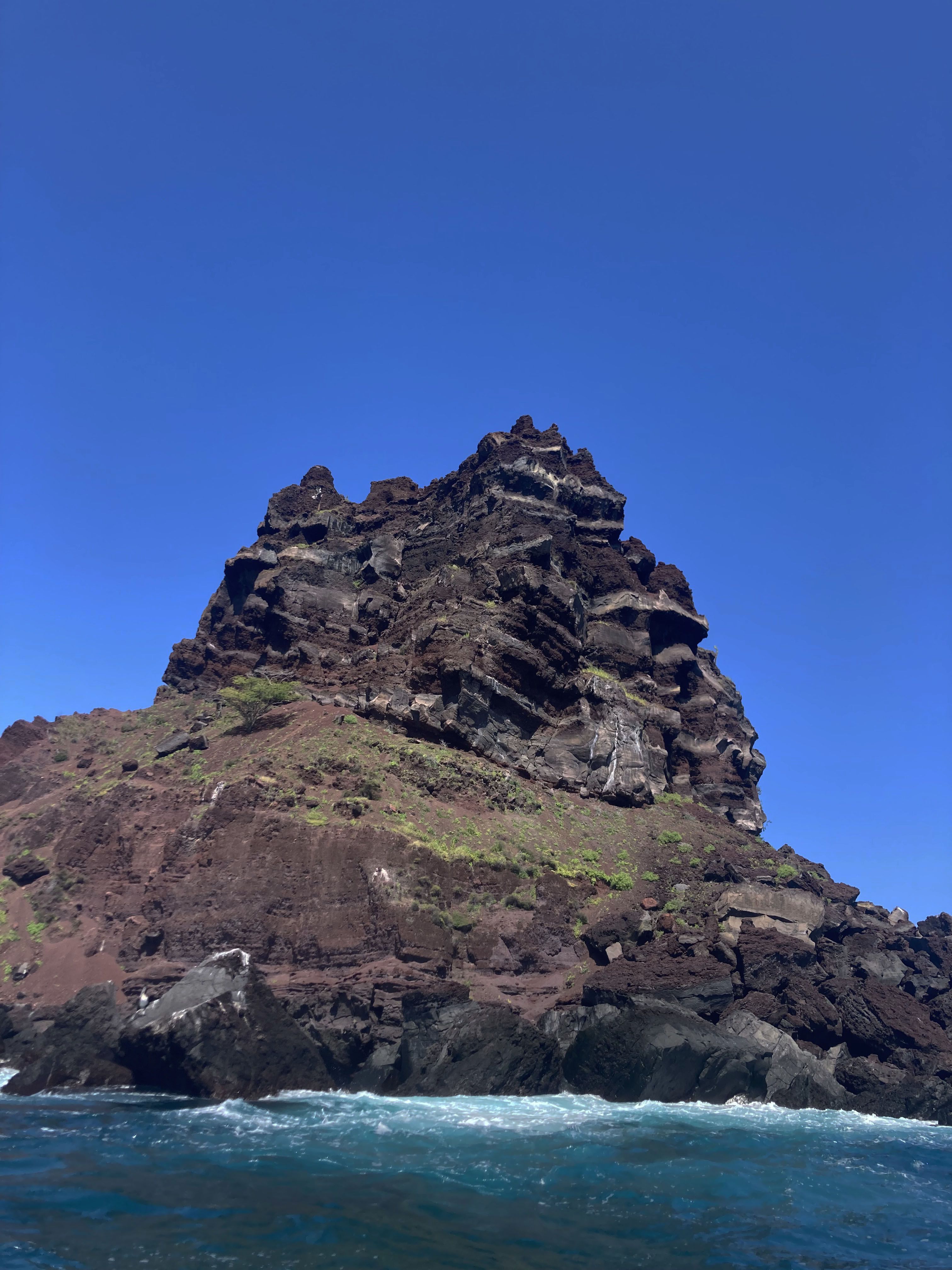 From the top, the view was spectacular. The flat terrain made our hike easier. Some blue-footed boobies use the area for nesting; we observed several of them incubating their eggs. In bushes and trees, red-footed boobies did the same. They have a brown or white plumage and a blue bill. Their fluffy chicks were the delight of our guests. In the distance and closer to the ocean, Nazca boobies nested on the ground or on flat rocks, leaving their white guano everywhere. In the air, frigatebirds and blue-footed boobies glided like kites as they looked for fish in the immense ocean.
