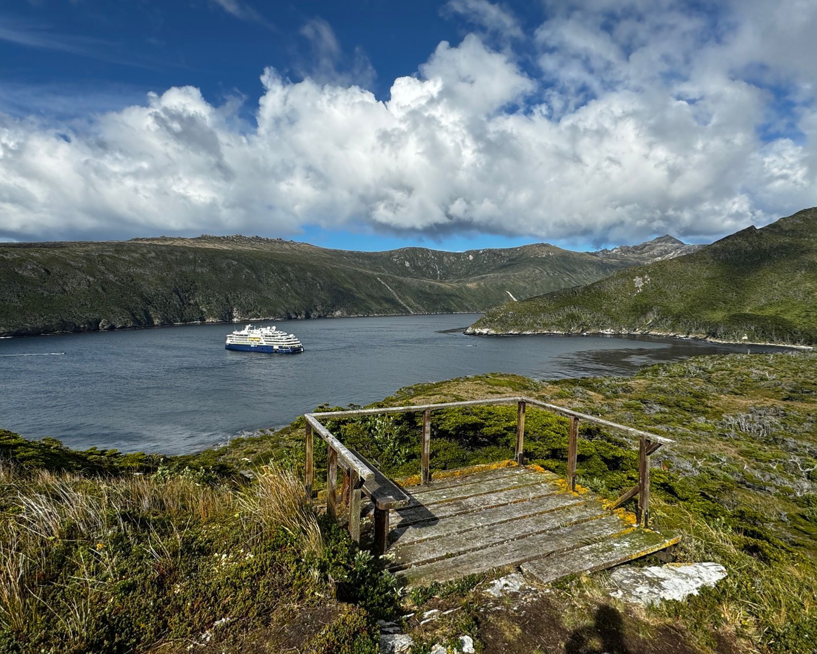 Wildlife from the shores, skies, and waters were the highlights for many. Geese, shags, and even penguins were observed and photographed during the morning Zodiac cruises. Albatross dove down, feeding on a huge bait ball of fish off the point of the bay. Many also saw sea lions and fur seals playing in the waters around the rocky island.