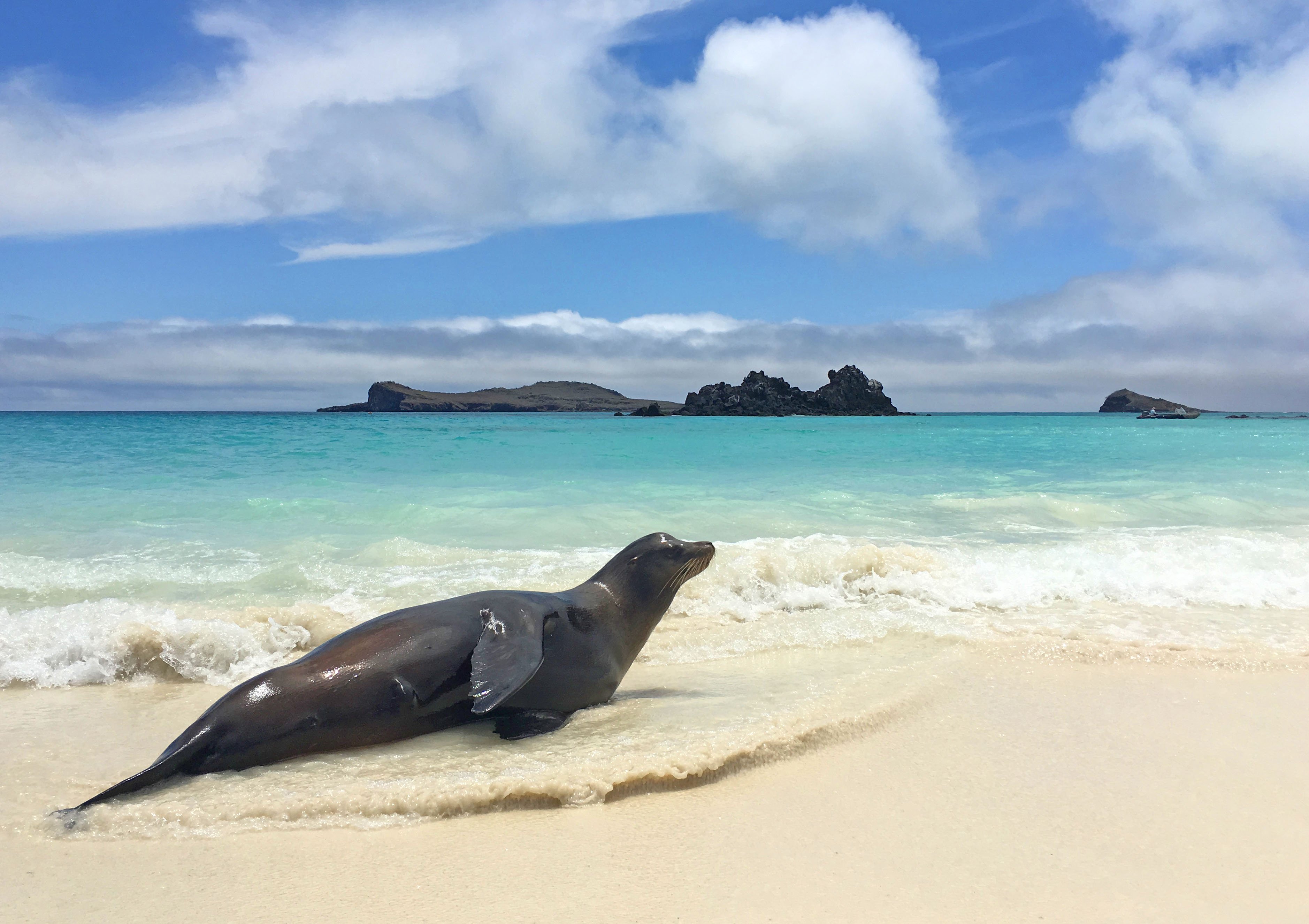 Wow! A terrific day! Before breakfast, as the sun was rising, we spotted a handful of humpback whales. They circled around, blithely feeding as we stealthily approached. After several minutes one of the whales split off and came close to the ship, surfacing beside the bow to great excitement. Then it dove under the bow, popping up on the opposite side. Guests dashed back and forth as it continued playing beneath the ship, exuding great plumes of fishy-smelling breath into our faces and cameras. The sun came up, casting golden light over the scene as the whale moved just below the surface, directly under the frantically snapping cameras on the bow. After rolling from side to side and launching its rostrum several feet out of the water to great delight, the whale finally swam away. We headed into breakfast, satisfied with a sunrise well spent.
