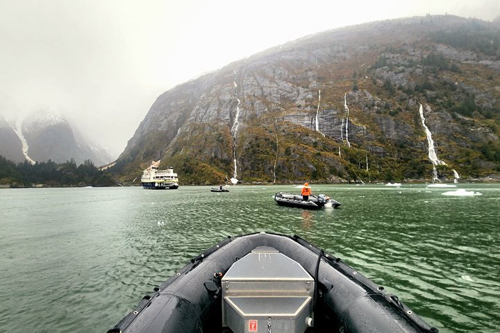 As guests were eating their lunch-time delicacies, the crew expertly maneuvered and anchored the National Geographic Sea Bird in Horsefly Cove. Zodiacs and kayaks were unloaded from the top deck, ready for explorers to investigate the shorelines from water level. The old growth forest of mixed trees gave evidence of how long ago the ice retreated from this region. A sharp line at the bottom of the forest delineated where terrestrial live could no longer survive, and wildlife that could survive inundation with salty water took over.