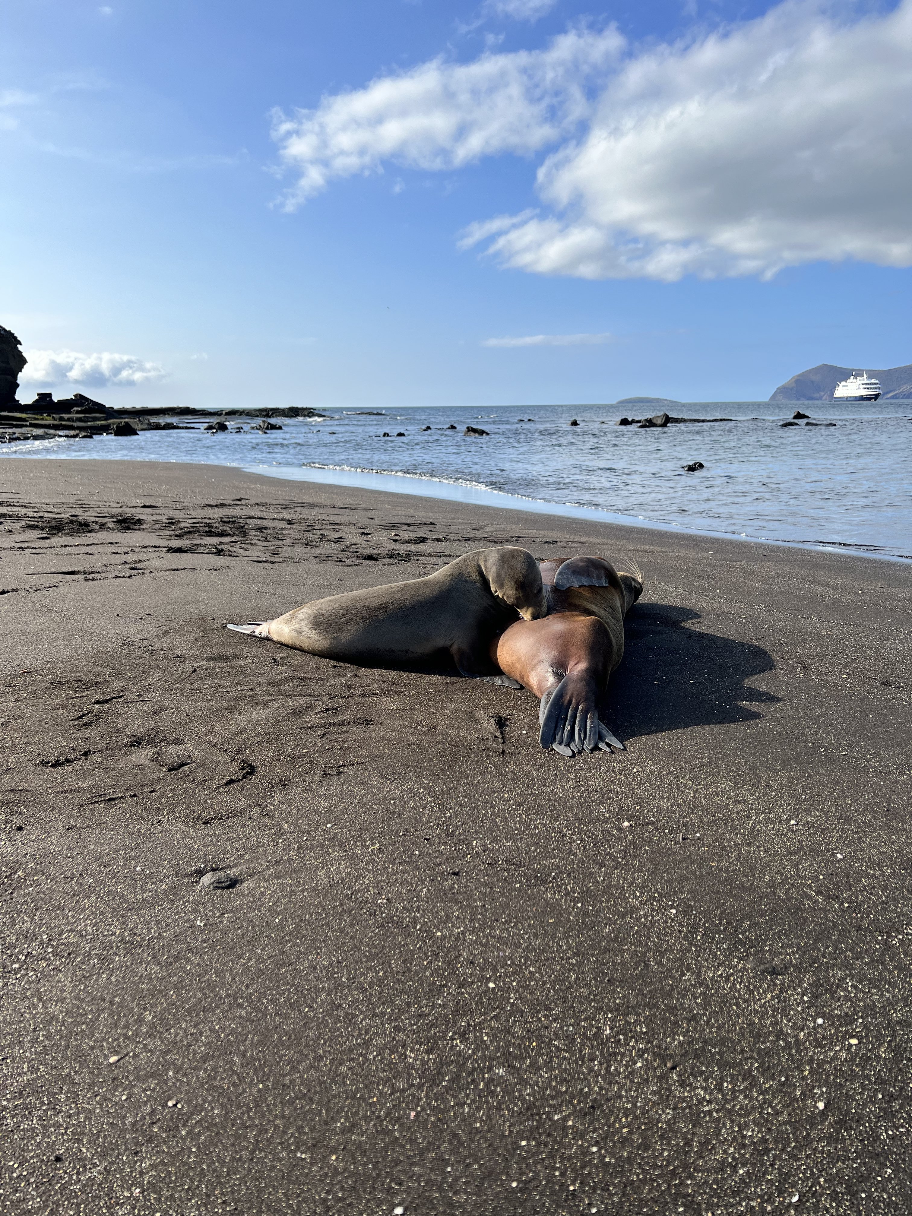 In the afternoon, we anchored in Tagus Cove, a popular site known by whalers back in the day. The area offers calm waters full of wildlife. We swam with penguins and sea lions. We also kayaked by the nesting sites of flightless cormorants, and we explored the cliffs where pelicans are nesting. Part of the group hiked around a beautiful saltwater lagoon to a viewpoint that offered a 360° view of Isabela Island and its volcanic features.