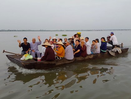 Back on the Jahan, we awaited two monks to arrive to do a blessing ceremony for guests and Jahan staff on the terrace deck. Two chairs are arranged in front of a table, filled with flowers and fruit. The blessing was recited in both Pali and Khmer, while water was sprinkled on the respectful crew seated on the floor with heads bowed and hands pressed together. Donations were collected for the monks and their temple, and fruit and food were also offered to the monks. One of our guides explained the proceedings and answered questions. It is customary to show respect to the monks by touching the ground or moving the hands in prayer three times to indicate the Buddha, Dharma (or Teachings), and the Sangha (or Monkhood).