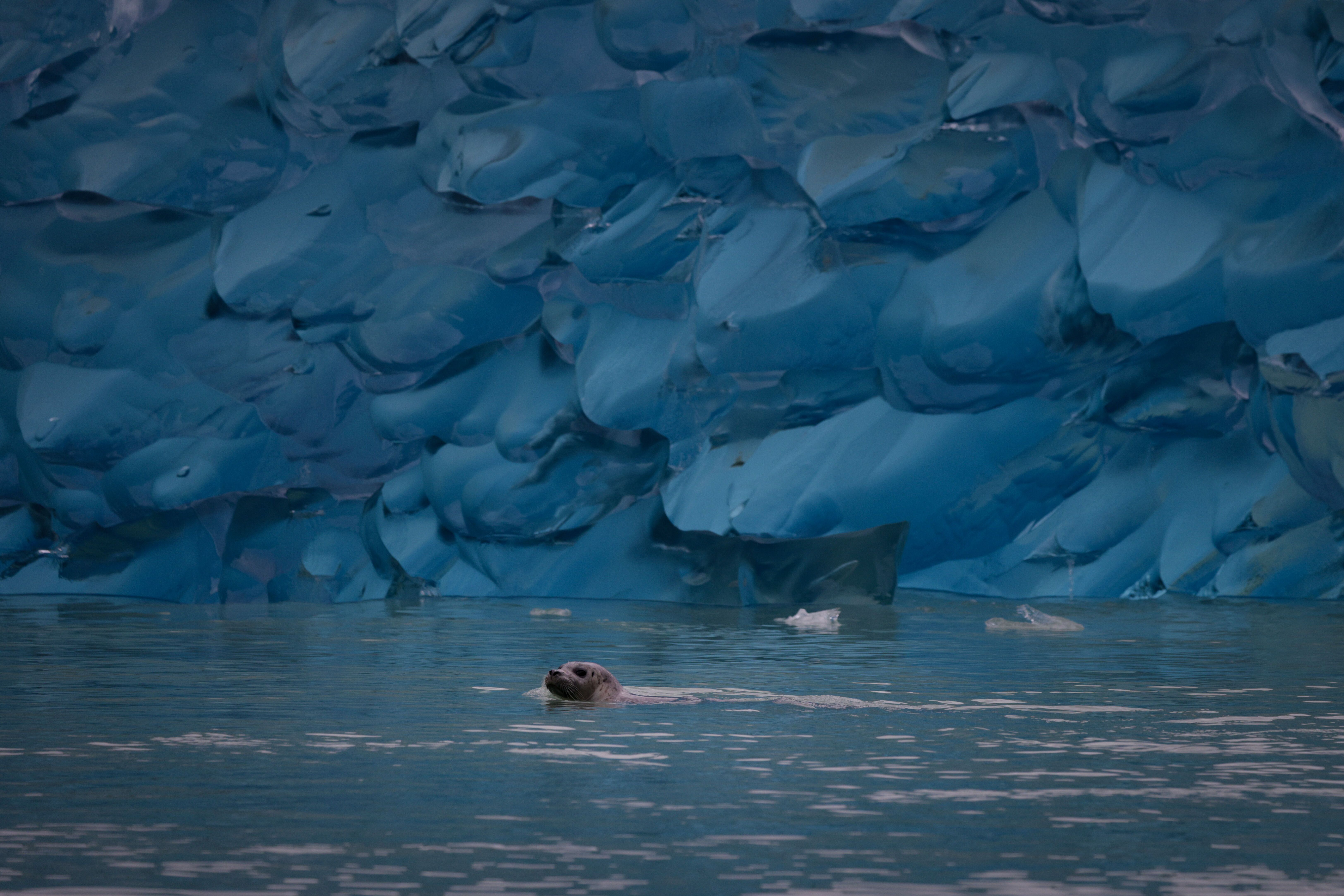 After lunch, we cruised farther up Tracy Arm, where we had the delight of viewing a male orca! We watched it dive down, and the pronounced dorsal fin cut through the surface of the water. We eventually made our way to South Sawyer Glacier, where we split into two groups for Zodiac tours to gain a closer look at all things ice. Bergy bits, growlers, and brash ice were examined up close. The deepest blue of the densest ice was glowing from fresh calving, and harbor seals galore were hauled out on the ice. After spending time in this otherworldly ecosystem, the Zodiacs cruised back to the ship. Various levels of succession were observed on the ride back, and once on board, guests were greeted with a cup of warm hot cocoa and spirits to get cocktail hour started in fashion. It was an adventure filled day in Tracy Arm!