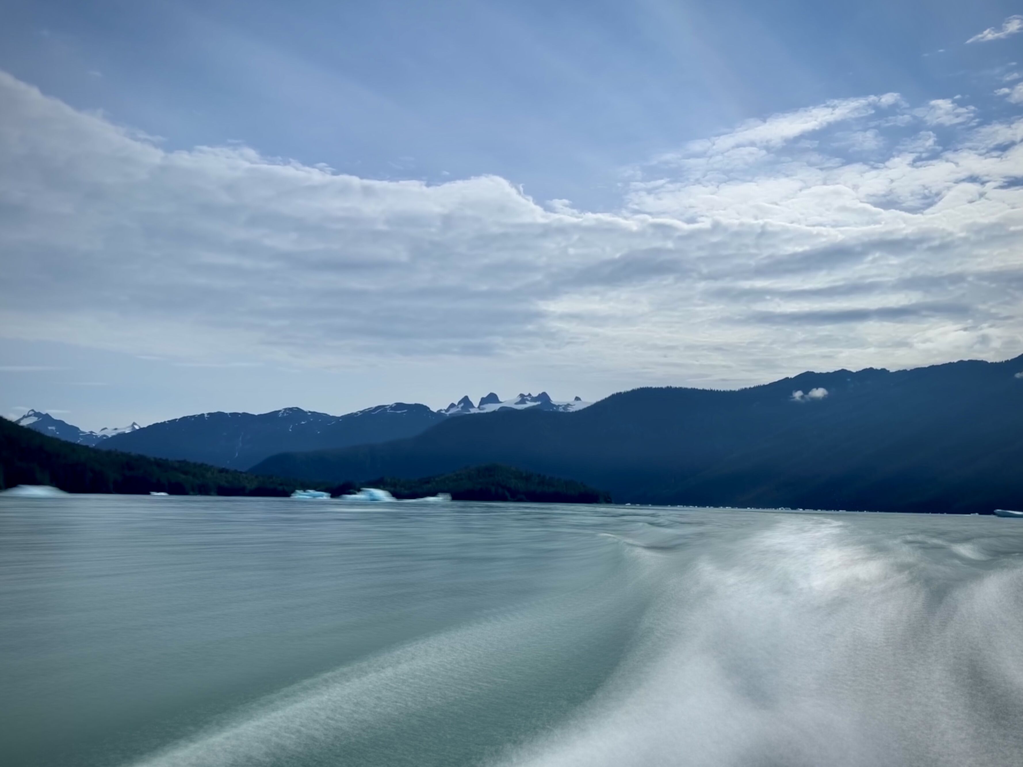 Dawes Glacier, located at the head of Endicott Arm in Southeast Alaska, is an active tidewater glacier in the remote Tracy Arm-Fords Terror Wilderness Area. Reaching the glacier requires a 30-mile journey through a narrow fjord lined with sheer rock walls rising over 3,000 feet. These cliffs are veined with waterfalls and often blanketed in mist. Throughout the fjord, remnants of the glacier float in the form of icebergs. The glacier feeds cold, silty meltwater into the fjord, giving the water a distinctive milky-green hue and supporting a rich marine food web. Harbor seals were hauled out on ice floes near the glacier. Gulls and Arctic terns were actively feeding, likely drawn by the small fish and plankton concentrated by the glacial outflow. The glacier calved several times, hurling large chunks of ice across the water’s surface, sending the birds fleeing. The sound of the ice hitting the water echoed off the steep rock walls that rise thousands of feet on either side.